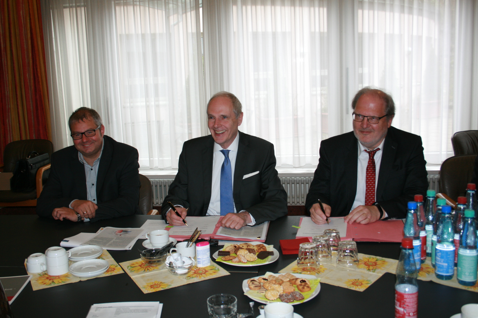 Alexander Guhl, Bürgermeister von Bad Säckingen, DGQ-Präsident Udo Hansen und Peter Mast, Geschäftsführer der Gesundheitscampus Bad Säckingen GmbH, bei der Unterzeichnung der Vereinbarung (v.l.n.r).