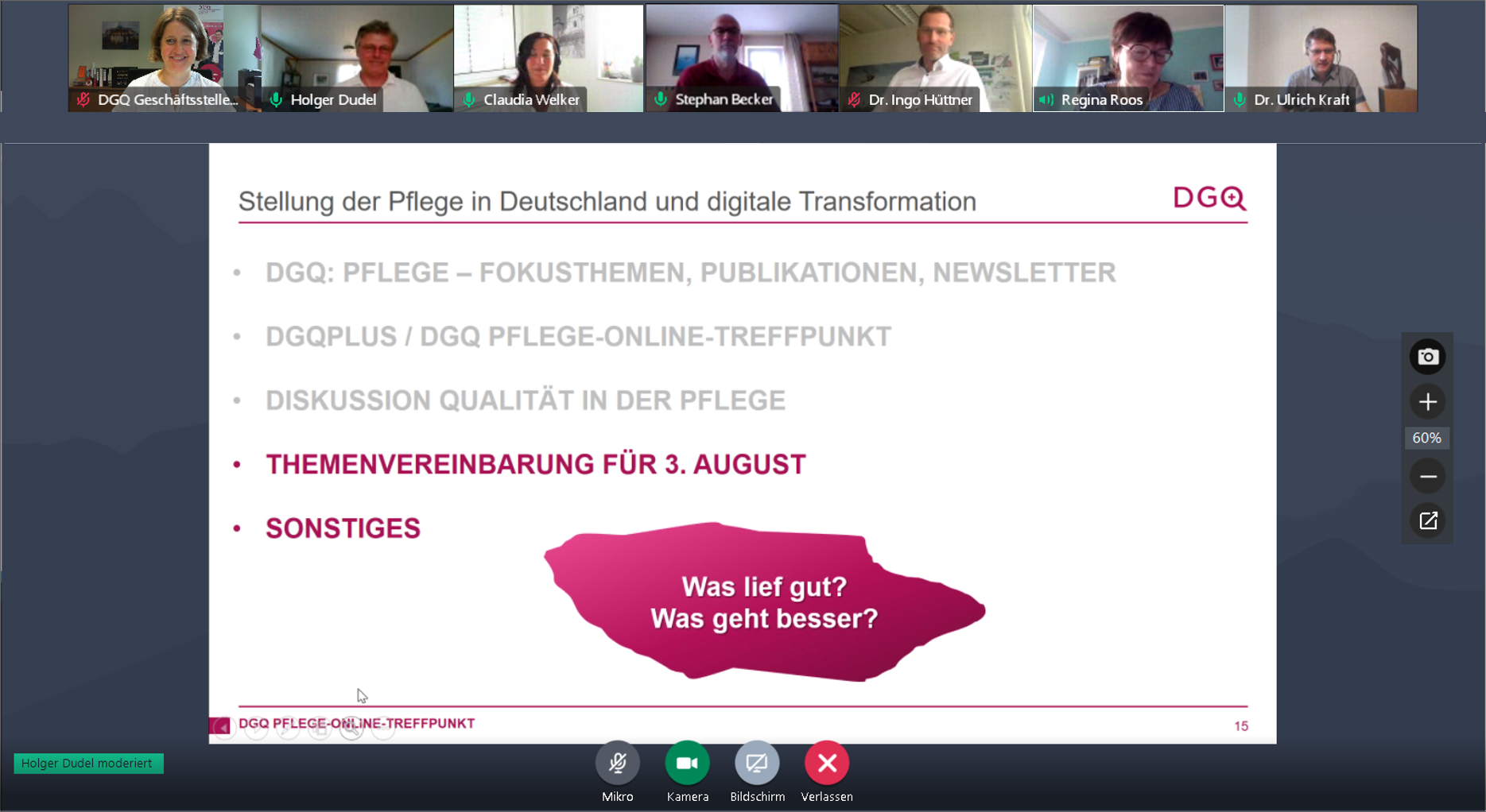Mit der 13. Sitzung hat der DGQ Pflege-Online-Treffpunkt in diesem Sommer seinen ersten Geburtstag gefeiert. Seit einem Jahr treffen sich jeweils am ersten Dienstag im Monat DGQ-Mitglieder aus dem Pflegebereich und weitere Interessierte online für neunzig Minuten und erörtern eine selbstgesteckte Agenda. Diese orientiert sich an sektorenübergreifenden Themen und reicht von Standards bis hin zur Beschreibung von Qualitätsperspektiven im Fachgebiet.
