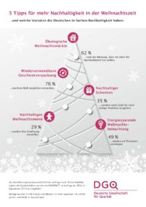 Geschenke, Glühwein und süße Leckereien – Die Vorweihnachtszeit lädt an allen Ecken zum Schlemmen und Genießen ein. Gute Vorsätze sind da ganz schnell über den Haufen geworfen. Vor allem beim Thema Nachhaltigkeit drückt man rund um weihnachtliche Traditionen gern ein Auge zu. Viele Deutsche fühlen sich zudem noch zu wenig informiert, um im Alltag selbst nachhaltig handeln zu können (43 Prozent). Die DGQ gibt fünf Tipps, mit denen sich die Weihnachtszeit nachhaltiger gestalten lässt und zeigt in welchen Bereichen die Deutschen laut Umfrage bereits gute Vorsätze beim Thema Nachhaltigkeit gefasst haben.