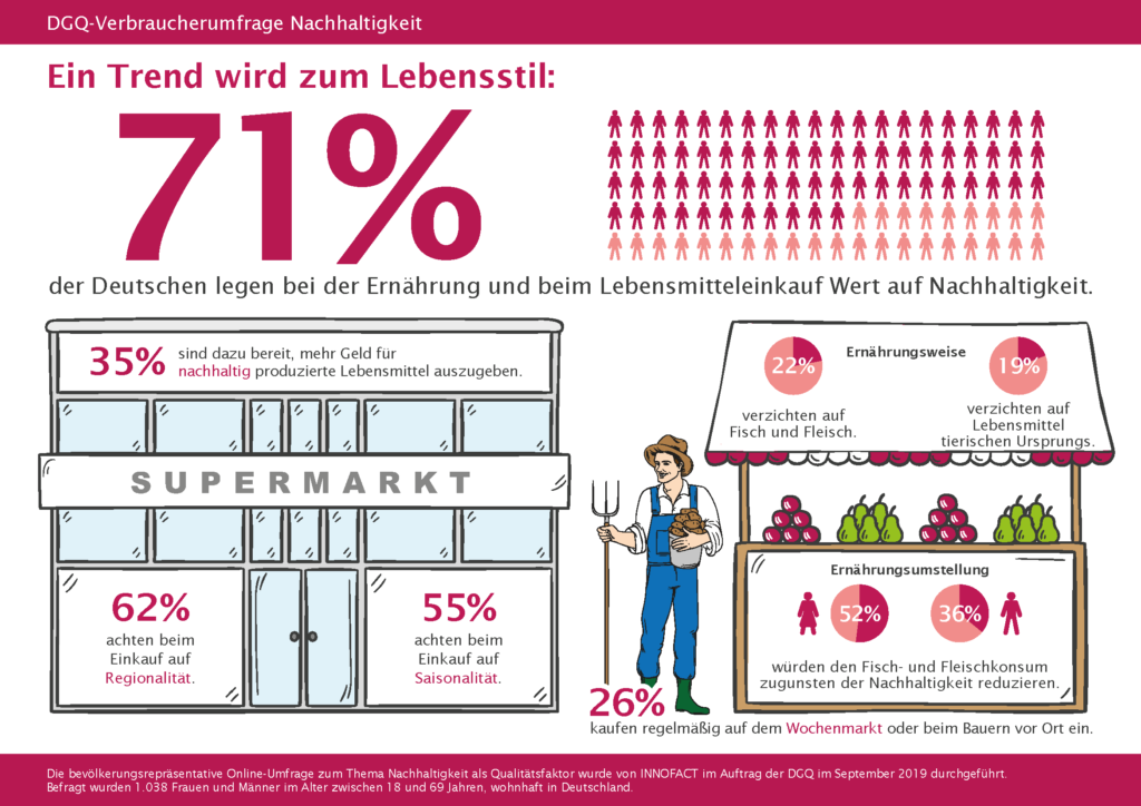 „Wenn es um Ernährung geht, begegnet uns das Thema Nachhaltigkeit schon lange. Die aktuelle Diskussion spiegelt sich auch in Ernährungstrends wider. Für Verbraucher wird Nachhaltigkeit zu einer immer selbstverständlicheren Anforderung an Produkte und damit als entscheidender Qualitätsaspekt immer bedeutender. Leider sind Nachhaltigkeitsaspekte noch nicht immer Kriterium für eine Kaufentscheidung. Tendenziell steigt aber die Bereitschaft für nachhaltig produzierte Lebensmittel mehr Geld auszugeben. Langfristig entscheidet die Haltung der Konsumenten darüber, ob eine nachhaltige Lebensmittelproduktion gelingt“, kommentiert Claudia Welker, geschäftsführendes Vorstandsmitglied der DGQ.