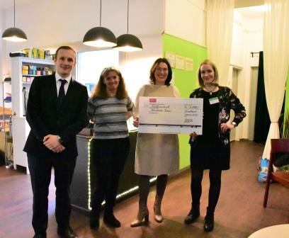 Stephan Knobel, Vorsitzender der Projektgruppe Bahnhofsviertel e.V., Monika Tiessen, Leitung Veranstaltungsorganisation bei der DGQ Weiterbildung GmbH, Claudia Welker, geschäftsführendes Vorstandsmitglied der DGQ, Nadine Müller, Leitung Teestube Jona, (v.l.n.r.) bei der Übergabe des Spendenschecks.
