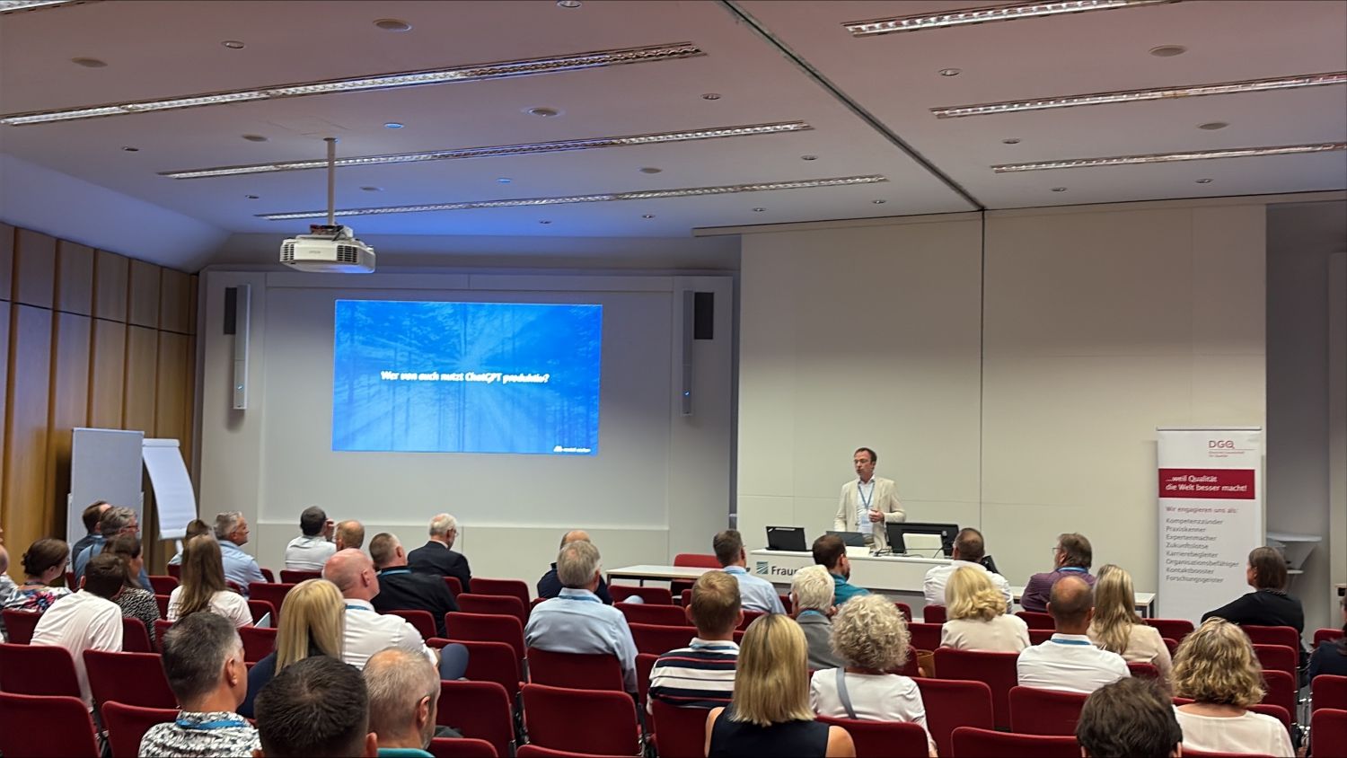 Im Anschluss an die Keynote konnten die Teilnehmer:innen aus einem Angebot parallel stattfindender Vortrags- oder Workshop-Einheiten zu unterschiedlichen inhaltlichen Schwerpunkten auswählen. Unter der Überschrift „KI im QM“ nahm Prof. Dr. Marco Huber, wissenschaftlicher Direktor für Digitalisierung und KI am Fraunhofer IPA, die Chancen der neuen Technologie aus technischer Perspektive in den Blick: Die KI eröffnet auch der Bildverarbeitung viele Möglichkeiten bei der Qualitätssicherung und Prozessoptimierung, wie er in seinem Vortrag erörterte. Auch Dr. Carsten Behrens, CEO der Modell Aachen und Mitglied im Leitungsteam des DGQ-Fachkreises „QM als Organisationsentwicklung“, zeigte unter der Überschrift „KI-powered Managementsysteme“ einige praktische Beispiele auf, wie KI schon heute die Arbeit in IMS deutlich entlastet. Den Nutzen von generativer KI für die Planung, Durchführung und Nachbereitung von Audits beleuchtete QM-Beraterin Judith Magono.