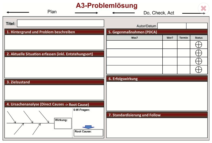 Der A3 Report ist eigentlich ein Werkzeug aus dem Hoshin Kanri Prozess. Das dort verwendete Dokument, siehe untenstehende Abbildung, bildet die Strukturen des 8D-Report ab und ist dadurch ein ideales Werkzeug, um im Unternehmen bei praktisch allen Problemen einen Lösungsleitfaden zu haben.