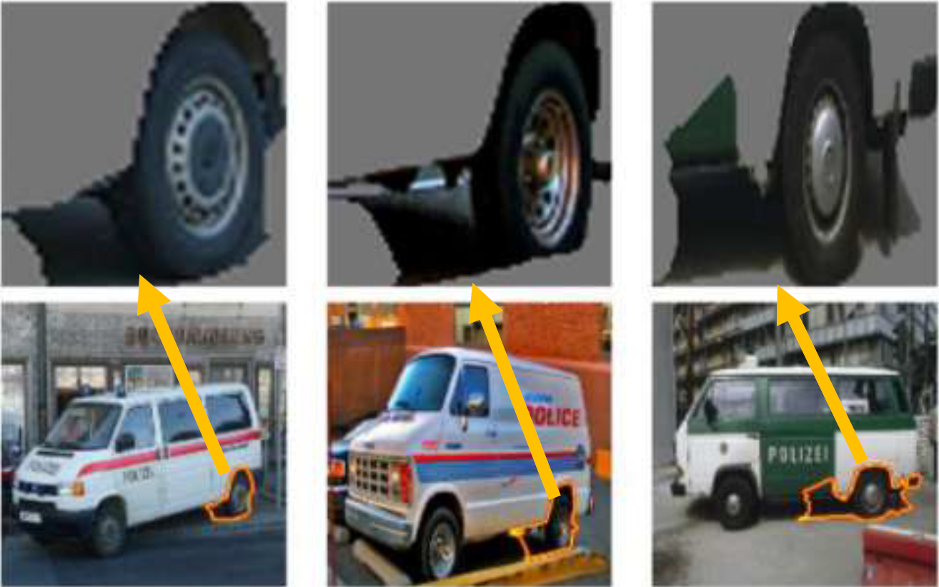 Konkret funktioniert die Extraktion eines Surrogats (zum Beispiel eines Entscheidungsbaums) aus einem Black-Box-Modell wie in Abb. 1 dargestellt. Zuerst wird unter Zuhilfenahme des Black-Box-Modells für alle Eingabedaten, bestehend aus Merkmalen und einer Sollausgabe, eine Vorhersage berechnet (links). Im Anschluss werden die Eingabemerkmale zusammen mit der Vorhersage des Black-Box-Modells dazu verwendet, das Stellvertretermodell zu trainieren (rechts). Dieser Ansatz eignet sich besonders gut für die Arbeit mit tabellarischen Daten. Für Bilddaten bietet sich hingegen beispielsweise die Verwendung von Konzepten an, die tiefe neuronale Netze erklären (Ghorbani et al. 2019). Hierbei werden automatisch visuelle Konzepte identifiziert, die für das Black-Box-Modell besonders wichtig waren. Abb. 2 zeigt das Beispiel eines Reifen-Konzepts, das für die Klasse „Polizeitransporter“ besonders relevant ist. Das Reifen-Konzept befindet sich in vielen Bildern von Polizeitransportern – unabhängig von ihren sonstigen Merkmalen wie Farben und Beschriftungen – und bildet deshalb ein zentrales Erkennungsmerkmal für diese Klasse.
