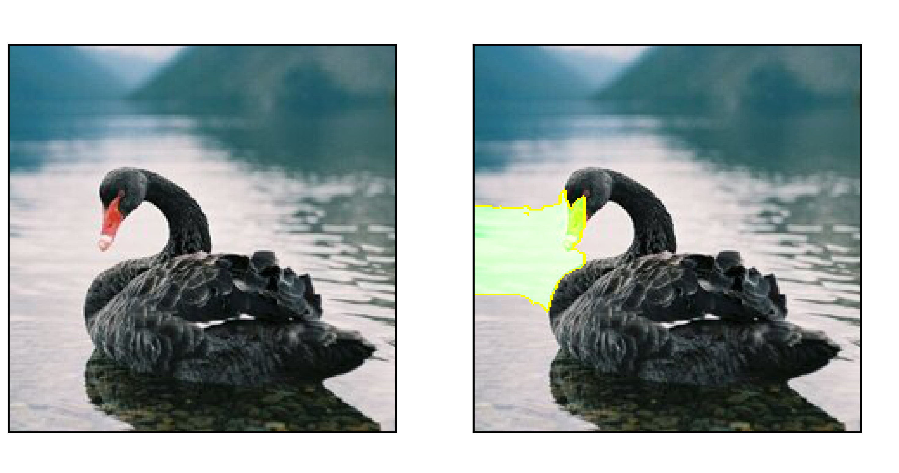 Abbildung 3: Erklärung der Klasse »Schwarzer Schwan« für das vorliegende Bild mithilfe der Methode LIME. Das Hauptmerkmal für diese Klasse ist der rote Schnabel. Quelle: https://images.app.goo.gl/NSmc6JEnzbr4b7tC7