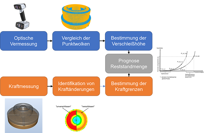 Die Ergebnisse, die mit der optischen Messung und die Ergebnisse, die mit der Kraftmessung erzielt wurden, führten die Wissenschaftler:innen im Rahmen des Projekts zusammen (Abb. 2). So kann eine Prognose zur noch verbleibenden Standmenge getroffen werden, die sowohl die Ergebnisse der optischen Verschleißmessung als auch der Kraftmessung berücksichtigt.