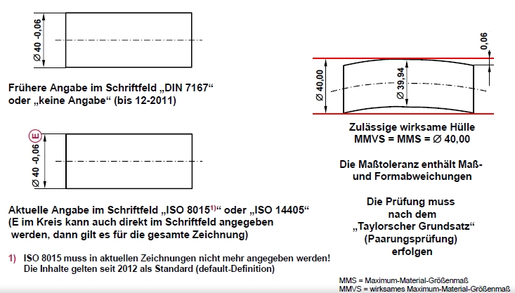 Bis Ende 2011 galt für Zeichnungen mit Angaben über DIN-Normen zu Toleranzen und Passungen automatisch die Hüllbedingung, wenn keine anderslautenden Festlegungen, wie zum Beispiel ISO 8015, enthalten waren. Diese älteren Zeichnungen sollten, um Missverständnisse zu vermeiden, beim Überarbeiten durch folgende Angabe auf den aktuellen Stand gebracht werden: “Size ISO 14405 {”.