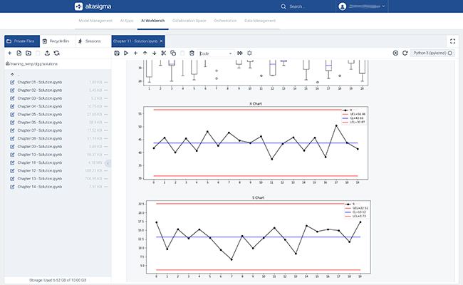 Um den Anforderungen an eine reibungslose Durchführung des E-Trainings gerecht zu werden, wurde mit AltaSigma eine moderne cloudbasierte KI-Plattform bereitgestellt. Die Teilnehmer können ausschließlich über den Browser darauf zugreifen. Somit werden lokale Installationen auf den Rechnern der Teilnehmer vermieden. Es ist zudem sichergestellt, dass sie mit den identischen qualitätsgesicherten Python Bibliotheken arbeiten können. Über AltaSigma haben alle Teilnehmer Zugriff auf die Daten, Übungen und Lösungen, welche per Notebooks bereitgestellt werden. Im Rahmen der Bearbeitung der einzelnen Übungen erlernen die Teilnehmer neben der reinen Programmierung in Python zusätzlich das kollaborative Arbeiten in einer modernen cloudbasierten KI-Plattform.